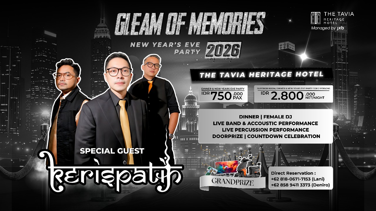 The Tavia Heritage Hotel mempersembahkan sebuah perayaan untuk Menyambut malam Tahun Baru 2026 dengan bertemakan “Gleam Of Memories: New Year’s Eve 2026 bersama Kerispatih” yang akan berlangsung pada malam 31 Desember 2025.